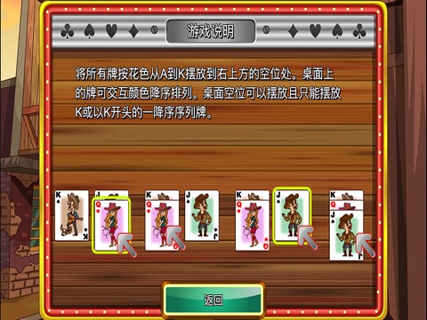将所有牌按花色从A到K摆放到右上方的空位处。桌面上的牌可交互颜色降序排列。桌面空位可以摆放且只能摆放K或以K开头的一降序序列牌。