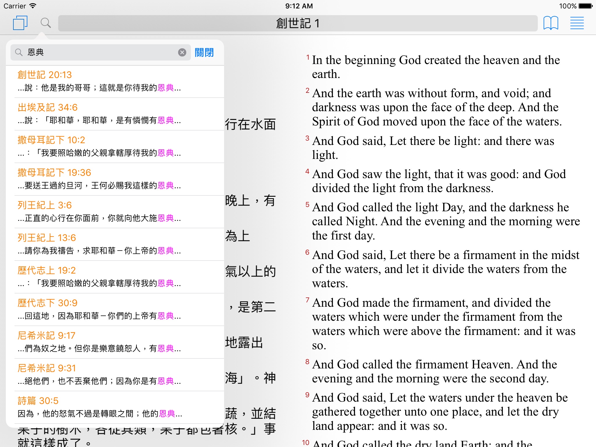 I used to carry a NT Bible to work. Now, I have both the OT & NT in my iPod. I have it for about a month and I am really happy about the purchase. Like: - easy to read backgroud - support Chinese in notes - support Chinese in search - return to my "last page" when returning to this app Suggestions for future releases: - when tap on the screen, shows the name of the book and the chapter - when navigate to a new book, default the chapter and verse number to 1