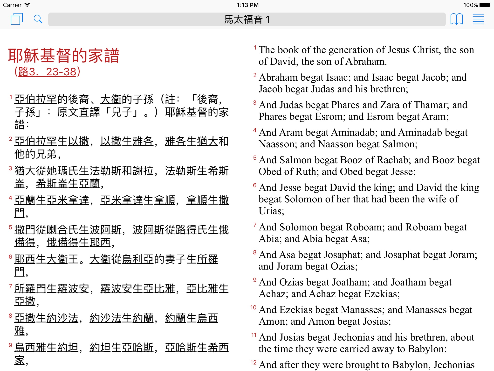 Touch Bibles is specifically designed for all Chinese iPhone users in the world with the complete support of tradition Chinese and simplified Chinese bibles. It is also the first bible app having the Dual-Bible view - different versions of bibles can show on a single page. The list of features are as follow: