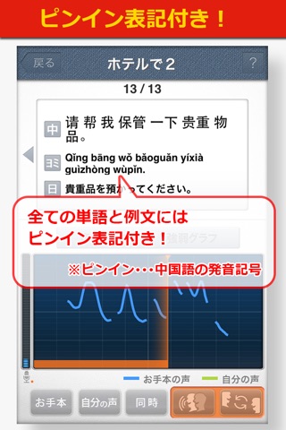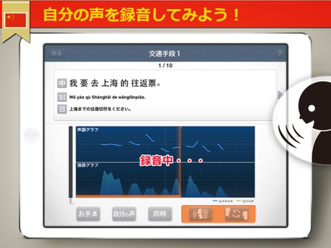 あなたのiPhoneやiPadに向かって発声すると「自分の声」が録音され、声調(イントネーション)と強弱(ストレスアクセント)が、波形グラフで表示されます。