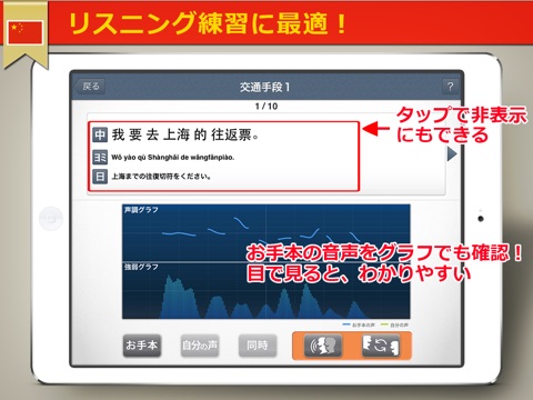 「お手本の声」と「自分の声」を声調と音の強弱の2種類の波形グラフで比較しながら、お手本の発音に近づけるように繰り返し声に出すことで、自然と正しい発音が身につきます。