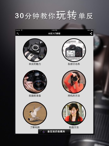 包括单反初识、部件认识、摄影准备、持机方法、拍摄方法、构图知识、摄影切记、拍照摆姿等必备的摄影技巧,让您快速玩转单反相机,立马成为摄影高手!