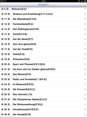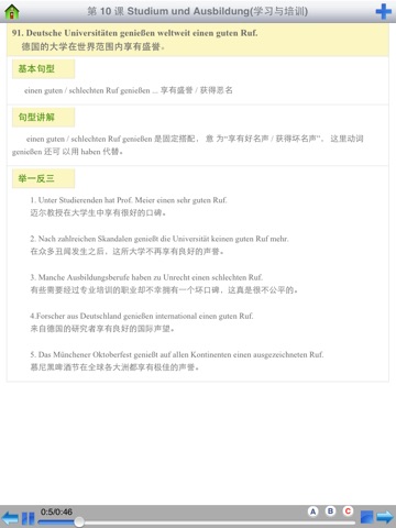 德语300句内容丰富生动、实用性强, 从语言、文化、思维模式三个层面向读者提供了极有价值的信息, 能迅速提高您的口语水平。熟练并恰当使用这些语句, 将会给人一种成熟、自信的感觉。该应用共有30单元, 每单元有10句组成, 每单元包括“文化常识”和“主干句子”。每句话包含“基本句型”、“句型讲解”、“举一反三”三部分组成的。该应用的德语发音清晰标准, 是用户学习德语或练习口语的好帮手。