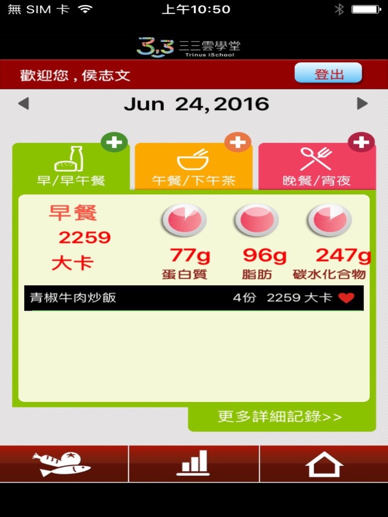 可記錄每天3餐的飲食 , 並自動分析出所攝取的營養值