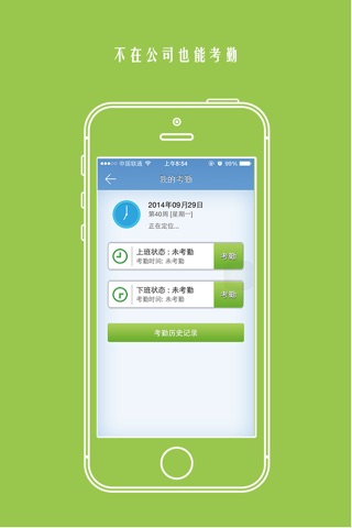 1.我的考勤:结合外勤人员当前的地理位置,在有效的工作时间进行考勤