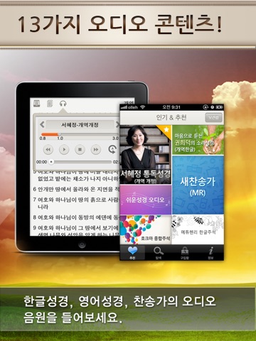 성경 역본을 비교하며 읽을 수 있고 성경과 찬송가를 동시에 보실 수 있습니다.