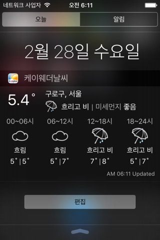 - 오늘과 내일의 예보 및 사전 강수 알림 등을 푸시 서비스로 제공하며, 동별 미세먼지 실황, 레이더 영상 등을 개선된 지도 시각화로 제공합니다.