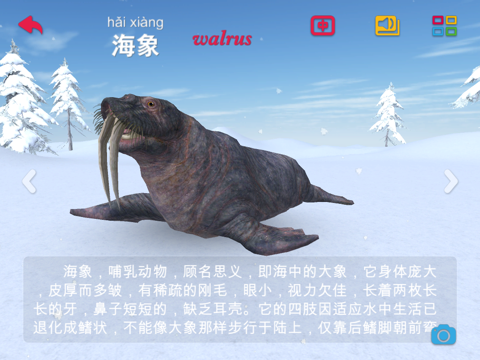 打开游戏可以看到惟妙惟肖的3d动物在不同的场景里出现,形象逼真,真实感强,点击触碰可发出叫声,变化动作。还可以放大缩小及旋转动物,以便近距离观察。