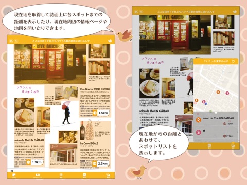GPSで現在地を取得し、周辺地図やスポットリストを表示します。また、誌面に現在地からの距離を表示することができます