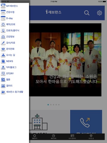 어플리케이션을 실행시키면, (예약/조회), (진료과/클리닉 정보), (건강정보), (검사/치료), (병원 안내 정보), (닥터 블로그 정보), (연세의료원 스토리) 등의 메뉴로 바로 연결할 수 있습니다.