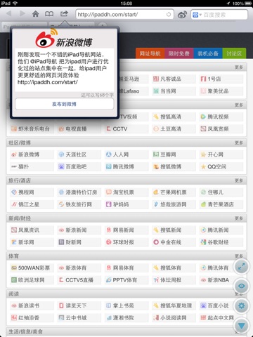 为iPad/iPhone 上网而生!目前最适合国人使用的触屏浏览器,现在支持全屏浏览和手势操作啦。中文网址导航是一个简单易用的多标签浏览器,并且集成了新浪微博分享服务,专为国人设计。自带的网址导航主页收录兼容iPad/iPhone的主流网站,让你畅享触摸上网的乐趣。