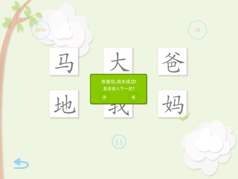 1、基于小学一年级生字表,按单元提供测试,让儿童学习者闯关: 听标准汉字发音,从随机给出的6个字选择正确的一字,每个测试共有20道题,正确率在80%以上闯关成功;