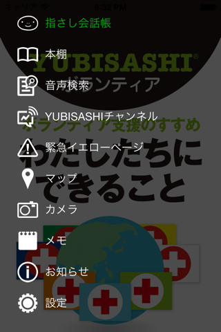 ボランティアの心得を掲載した「ボランティア支援のすすめ」や、相手に見せて指さすだけで通じる会話ツール「ボランティア支援指さし」が使える「本棚」のほか、ボランティア関連の記事を発信する「YUBISASHIチャンネル」、「マップ」、「カメラ」、「メモ」などの機能を搭載。「YUBISASHI」が、ほんの少しでもボランティア活動のお役に立てれば幸いです。