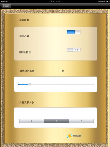 1、增加了軟件設置功能,包括設置搜索範圍,字體顯示大小,隨機顯示字詞數量等;