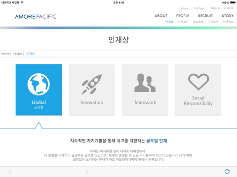 AP WAY, 회사소개, 경영이념, 인재상, 복리후생 등의 내용 제공