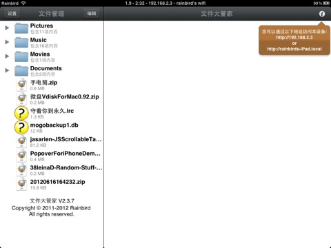 简单来说《文件大管家》就是一个文本和文件管理专家.她通过多种方式(wifi,usb,蓝牙,二维码等),在不同的设备(pc,Mac,iPhone,iPad,iTouch)之间进行方便的文本和文件交换。
