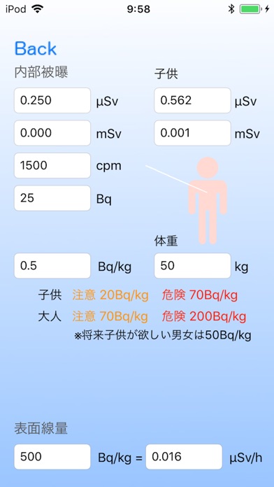 内部被曝の変換式は本来はもっと複雑なのですが、ここでは全ての放射能はセシウムであると仮定して、おおよそざっくり計算しています。あくまで目安としてお使いください。