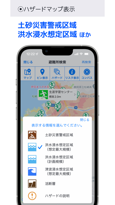 ・土砂災害警戒区域、洪水浸水想定区域、津波浸水想定区域のハザードマップを表示します。