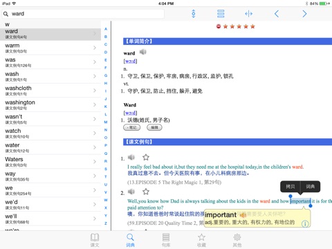 8.词典功能:本软件尽可能收录了所有课文所有句子的英文单词, 每个单词列出了对应的课文及某一句, 除个别单词或词组外均具备清晰的真人发音和音标。非软件收录的单词和中文可以通过OK词典查找。