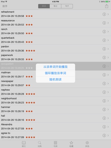 10.收藏功能:支持单词收藏和任意课文句子的收藏,在收藏界面对收藏的单词,有笔记的单词及收藏的句子分别整理,支持日期,等级和字母的排序. 收藏界面里的句子/单词支持后台播放,点击指定句子/单词可以选择从此项播放或循环播放,且支持耳机线控。