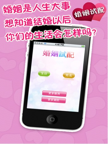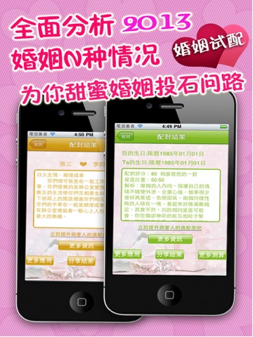 世界上最强大的婚姻配对应用,国内外多位著名大师结合姓名、生肖、星座等等各个相关专业领域,精确地为您测算出您和您的爱人在未来2013年将会面对什么样子的挑战。