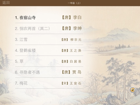 《画》宋•佚名、《草》唐•白居易、《登鹳雀楼》唐•王之涣、《寻隐者不遇》唐•贾岛、《悯农两首(其二)》唐•李绅、《夜宿山寺》唐•李白、《江雪》唐•柳宗元、《梅花》宋•王安石