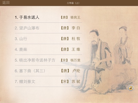 《咏柳》唐•贺知章、《惠崇春江晓景二首(其一)》宋•苏轼、《春日》宋•朱熹、《游子吟》唐•孟郊、《春夜喜雨》唐•杜甫、《送杜少府之任蜀州》唐•王勃、《绝句四首(其三)》唐•杜甫、《江畔独步寻花(其六)》唐•杜甫