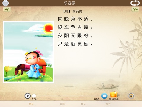 《乐游原》唐•李商隐、《赠花卿》唐•杜甫、《暮江吟》唐•白居易、《秋夕》唐•杜牧、《从军行(其四)》唐•王昌龄、《鸟鸣涧》唐•王维、《采莲曲(其二)》唐•王昌龄、《夏日绝句》宋•李清照、《百忧集行》唐•杜甫、《浪淘沙(其一)》唐•刘禹锡、《宿建德江》唐•孟浩然、《墨梅》元•王冕、《独坐敬亭山》唐•李白、《别董大(其一)》唐•高适