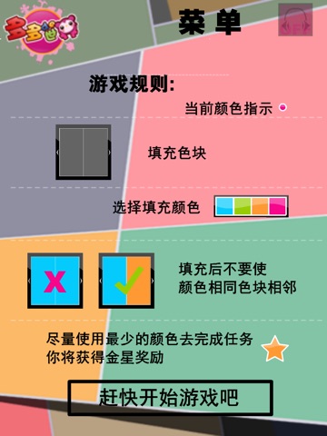 **玩法** 触及上方的色条,将游戏区域填上不同的颜色即可,相邻的区域颜色不能相同。