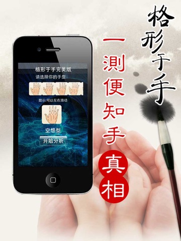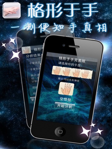 打开格形于手完美版, 你会看到各种不同类型的手掌和手指, 你可以通过滑动来选择不想要了解的那个手掌, 然后点开始分析, 格形于手就会给你相应的资料。包括手掌类型、手掌别称、助运物、特征、性格、缺点、适合职业等专业的资料。