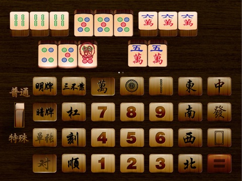 1、用手指上下划动左下方“普通/特殊”开关,可以在“基本牌型”和“特殊牌型”间切换。基本牌型为“四副一将”型,特殊牌型分为“七对”、“十三幺”和“全不靠”型。要输入“七对”,先将“普通/特殊”开关拨到“特殊”位置,再按“对”按钮;要输入“十三幺”或“全不靠”,先将“普通/特殊”开关拨到“特殊”位置,再按“单张”按钮。