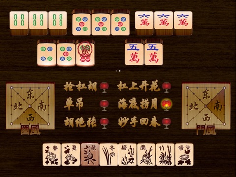 4、如果要输入牌面不能反映的信息,如“抢杠和”、“门风”、“花牌”等,可在键盘上横向划动,进入附加信息输入屏幕。“圈风”、“门风”按钮,每按一下,方向顺序切换一次。要返回键盘屏幕,可横向划动屏幕下半部分;要直接看计算结果,可向下划动屏幕下半部分。