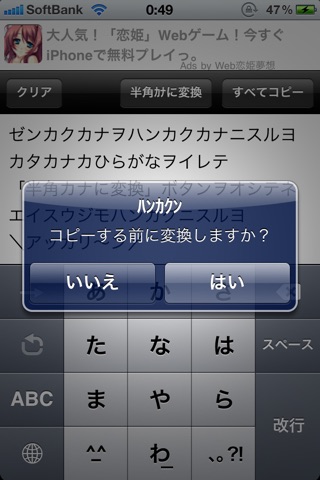 ひらがな又はカタカナを入力すると、半角カタカナに変換できます。