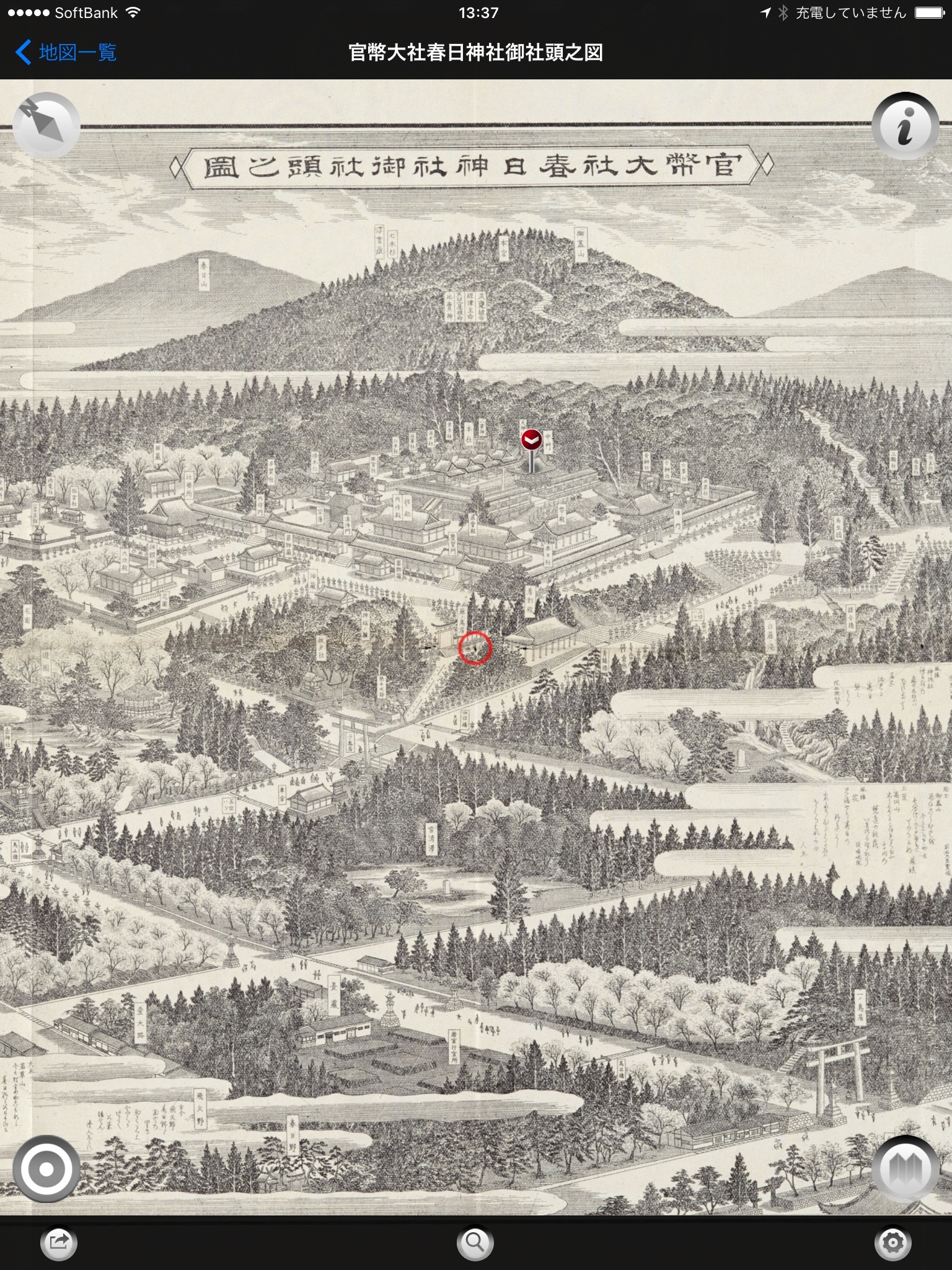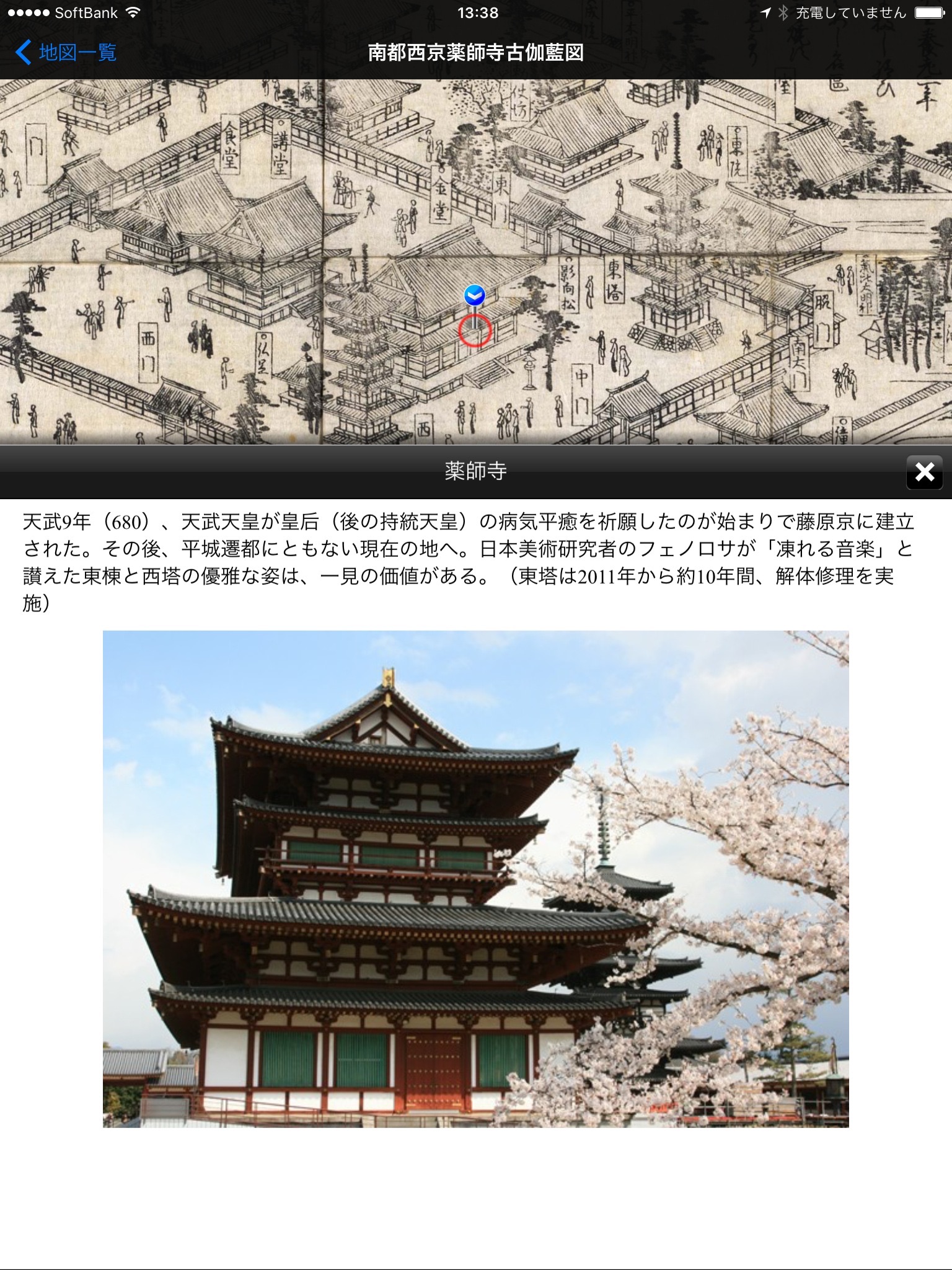iPhone/iPad対応地図アプリ、「奈良絵図紀行」では、古地図の上に現在地を表示し、標準地図と切り替えて見ることができます。