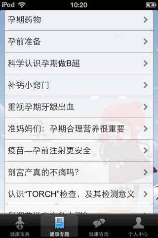 本软件还提供健康咨询功能,妈妈可向专业产科儿科专家咨询相关健康问题,让用户与专家一对一的实时互动,并及时了解自己的健康信息。