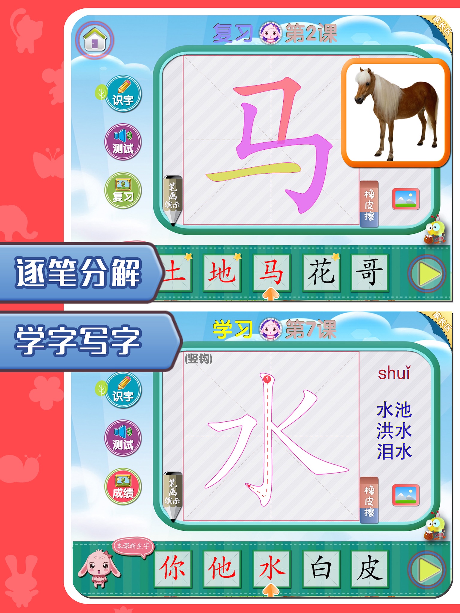 *有趣的激励机制,激发孩子识字兴趣,笔顺演示、描红、拼音、图片、词组、手写纠错,手把手教孩子写汉字。