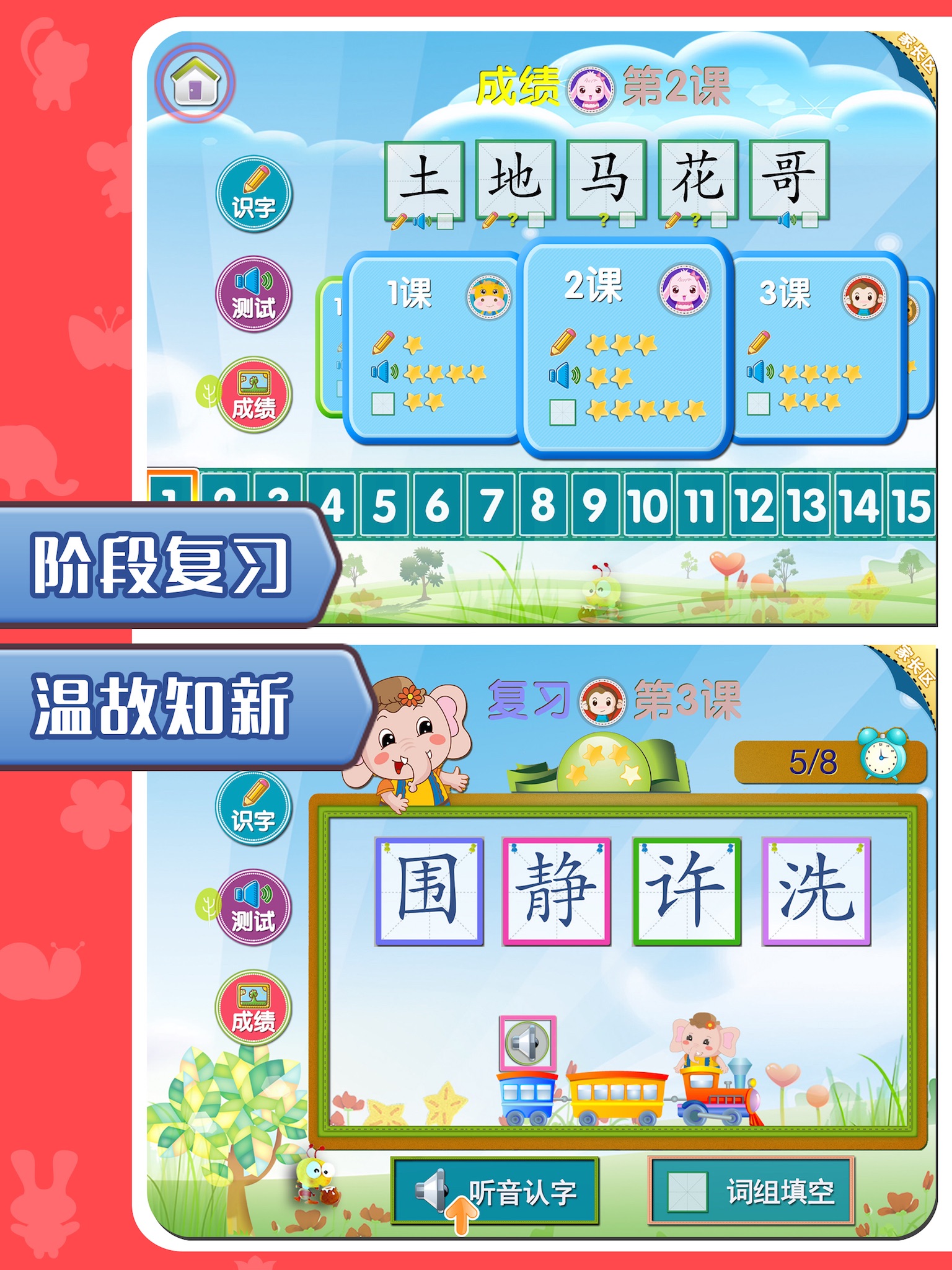*认字游戏寓教于乐,阶段复习温故知新,指定单元可反复学习测试,通过对未掌握汉字重复训练,来强化记忆。