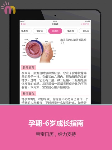 1:预产期计算+孕育指南:按周推送胎宝宝生长状况,妈妈身体变化及营养推荐,让怀孕的你不再迷茫。