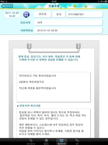 회원이 의사에게 진찰받고자하는 내용을 작성해 보내면, 이를 보고 의사는 진료시간활용 및 정확한 진료를 할 수 있고, 회원은 같은시간에 충분하고 만족스러운 진찰을 받을 수 있다.