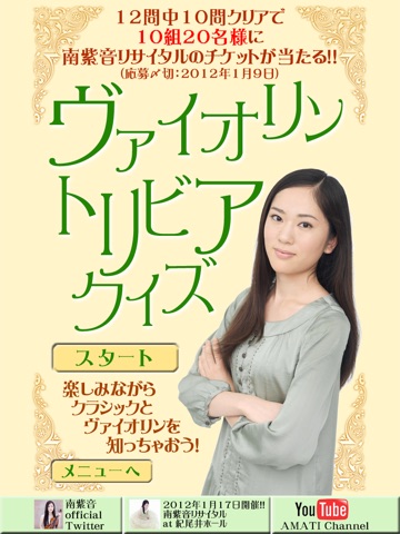 2012年1月17日に紀尾井ホールで行われる南 紫音のヴァイオリン・リサイタルに、クイズに答えてくれた方の中から抽選で10組20名様をご招待します。クイズ内容は、ヴァイオリンのことから南 紫音自身のことまで、難易度 含めて幅広いものとなっております。