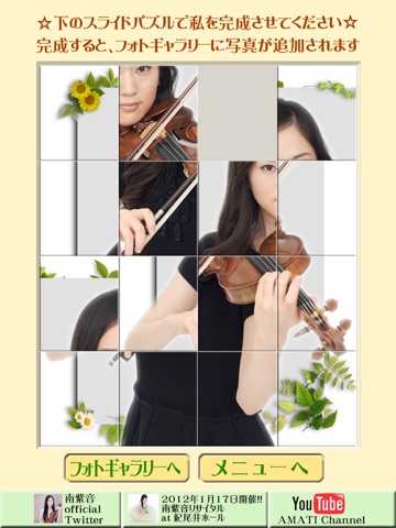 南 紫音の写真を使ったパズル・ゲームを収録しています。ゲーム・スタートまでのカウントダウンの間に、シャッフルする過程を見ることができます。これによって、混ぜた手順を記憶しておくと解きやすいという、記憶ゲームとしての側面もプラスしております。またパズル・ゲームをクリアしてフォト・ギャラリーの写真が集まっていくと、パズルのシャッフルが複雑化していくのと同時に、ユーザーに見せるシャッフルする過程のスピードが上がっていき、難易度が上がる仕組みになっています。