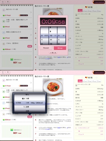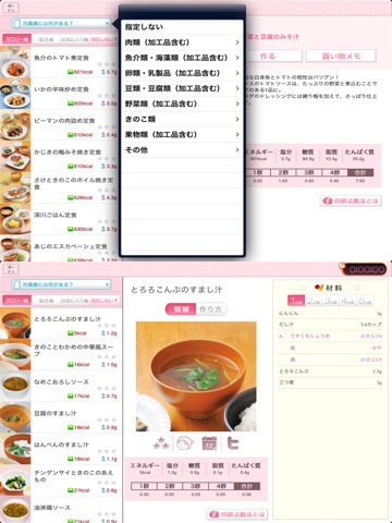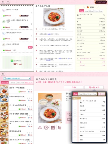 レシピの内容はとてもいいです。書籍版より安価なのもマル。 ですが惜しいところでアプリの良さを活かしきれていないのが残念です。 人数をタップするだけで材料を計算をしてくれるのは便利なのですが、お買い物メモが定食メニューしか対応していないので、単品を組み合わせたり、副菜をもう一品追加したりすると、結局手書きでメモを取り直すハメになります。 カレンダーが何を作ったかの記録しかできず、作り方や材料にリンクしていないのも残念。 カレンダーで何を作るか入力→iPhoneで材料のメモを見ながらお買い物→家に帰ってiPadでレシピを見つつ作る という使い方ができるととても便利なのですが。