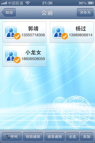 l 通讯录、群组管理简单方便,助您快速发起会议、语音通知和短信通知;