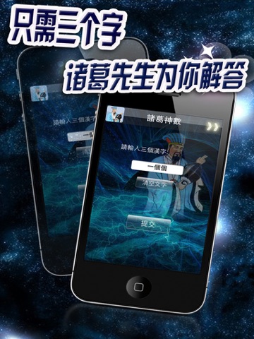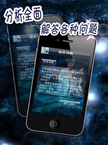 诸葛神数相传是三国时代刘备的军师诸葛亮所作。根据历史记载, 诸葛亮上懂天文, 下晓地理, 料事如神, 用兵用人, 皆恰到好处。诸葛亮每遇难题, 必暗自用一种独到的占卜法。心要诚, 手要净, 焚香向天祷告, 然后, 在纸上写三个字。这三个字, 即是天灵与人心灵交流, 也就是说, 你的心事已得上天了解, 而上天会对你作出指示。所以万万不可存“玩一玩”的心态。诸葛神数, 共三百八十四爻, 谶语句法, 长短不一, 寓意深远, 对占卜者的思路, 有很大的启发作用, 特别是那些正陷于彷徨迷惘中的人, 更有一种拨开云雾, 重见天日的豁然开朗感觉。因此这是可以作为判断吉凶, 决定进退, 是选择趋吉避凶的指南针。