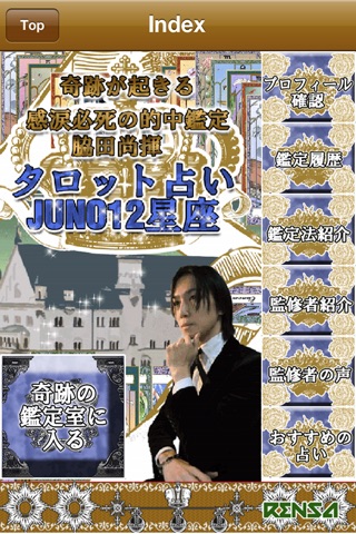 涙が出るほど当たる…、幸せになれました。と感涙必死の的中力で数々のメディアを騒がせている鑑定士「脇田尚揮」が、特別なタロットと特別な12星座であなたの生まれと宿命、人生、運命についてゾディアックコンサルタントとしての資質を活かし的確に導きます。タロットではその時のあなたのインスピレーションと運勢から、今の状況を導き、今後の打開策を的確にお教えします。またJUNO占星術では、あなたが生まれ持った本質を的確に見抜くことで、今後どのような人生を歩むのか?運命は?といった疑問に対して確実な答えをお教えします。