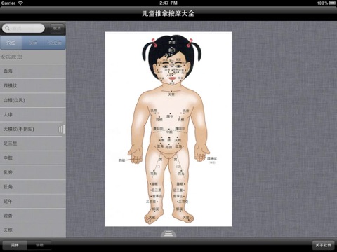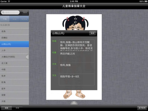 本软件按照展示了儿童的人体92个穴位和169种疾病,能帮助各个家庭防病健身的好助手,也是医生、按摩师的参考手册。