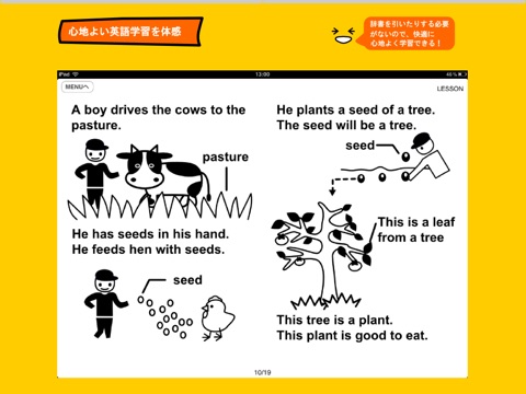 アプリの説明以外日本語は使用されていませんが、豊富なイラストを使うことにより、感覚で英語を理解することができます。いちいち日本語に訳したり、辞書を使う必要はありません。