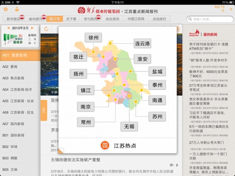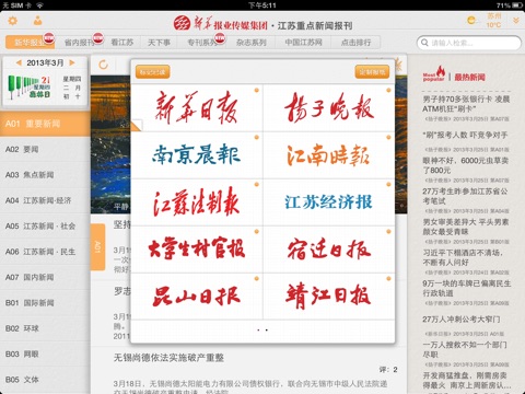 其他报纸有《南京晨报》《江苏经济报》《江苏法制报》《江南时报》《大学生村官报》《靖江日报》《海门日报》《东台日报》等, 更有近30余份江苏省内报刊,杂志有《群众》《党的生活》《传媒观察》等, 一款应用在手, 江苏重点新闻报刊尽在其中。