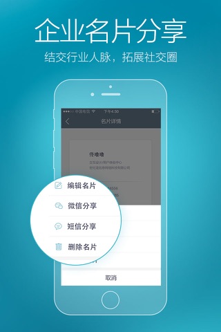 编辑属于自己的云名片,或扫描二维码,或雷达搜索,就可实现快速精准的名片交换、名片管理、人脉拓展等一站式商务需求。