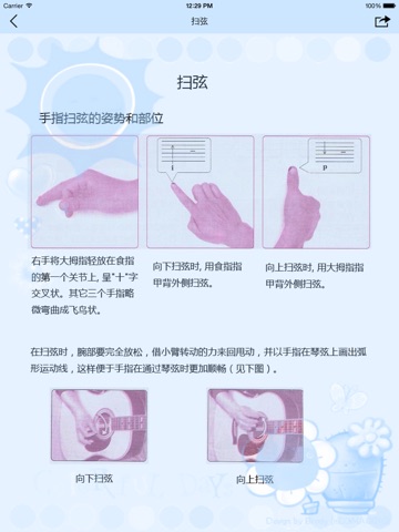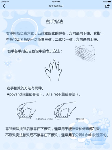 每一类都先讲解基础知识,然后是练习曲谱和演奏曲谱。比如,对于右手指法的练习,我们会先讲解右手各个手指一般所拨的弦和具体拨弦方法,然后提供常用右手指法练习曲谱,最后是演奏曲谱:"爱的罗曼史"详细按弦,指法讲解。